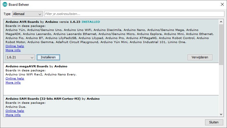 Het oled-schermpje dat we gebruiken, is al wat ouder en dat geldt ook voor de bibliotheek U8glib.h. Helaas blijkt deze niet compatibel met de meest recente instellingen van de IDE, zodat we die eerst gedeeltelijk moeten terugzetten naar een oudere versie. Dat is gelukkig zo gedaan. Start de IDE en klik op Hulpmiddelen / Board / Board Beheer. Selecteer bij Arduino AVR Boards by Arduino versie 1.6.21 en klik op Installeren. Als het goed is, staat daarna INSTALLED achter deze versie. Beantwoord de vraag Wil je Arduino AVR Boards bijwerken? met No.