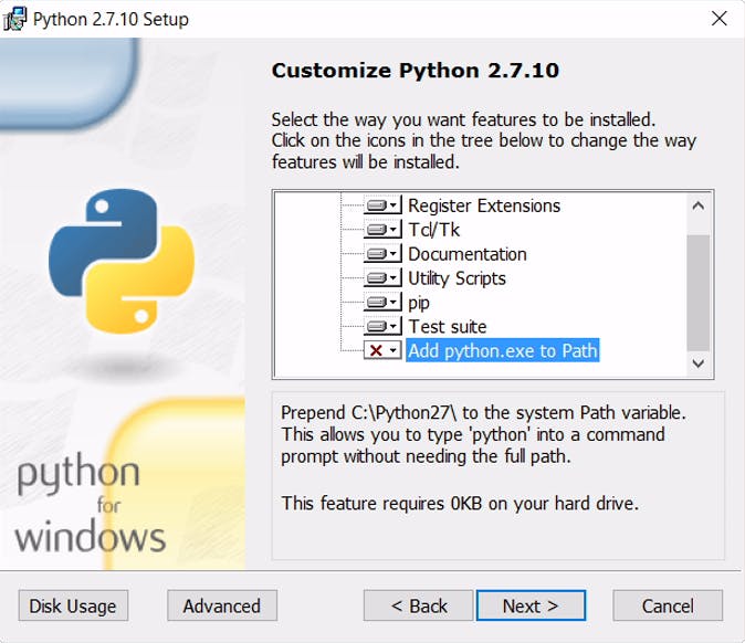 Zorg ervoor dat Python aan het systeempad wordt toegevoegd door op het kruisje te klikken en te kiezen voor Will be installed on the local hard drive.