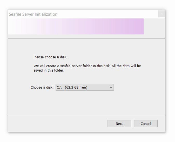 In de tar.gz zit een tar-bestand, en daarin zit dan weer de daadwerkelijke map met alle serverbestanden. Deze map moet je plaatsen in C:\SeafileProgram. Heb je dat gedaan, open de map dan en klik op run.bat om de Seafile-server te starten. Er verschijnt een venster waarin je aangeeft waar de bestanden die je in de cloud wilt opslaan op de lokale pc moeten komen staan. Kies een schijf waarop voldoende opslagruimte beschikbaar is en kies voor Next. Daarna wordt Seafile geïnitialiseerd en kunnen Windows Firewall-meldingen verschijnen van Seafile en Python, omdat er wel het een en ander aangezet moet worden.