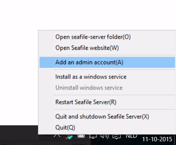 Klik met de rechtermuisknop op het systeemvakpictogram van Seafile en klik op Add an admin account.