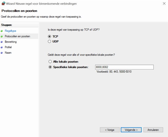 Vul bij lokale poorten de poorten 8000 en 8082 in, zodat Seafile bestanden kan synchroniseren.
