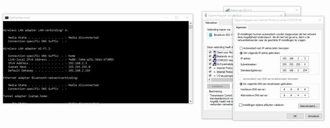 Zorg ervoor dat de waardes die je ziet bij ipconfig, overeenkomen met de waardes ingevuld in de eigenschappen van je verbinding.