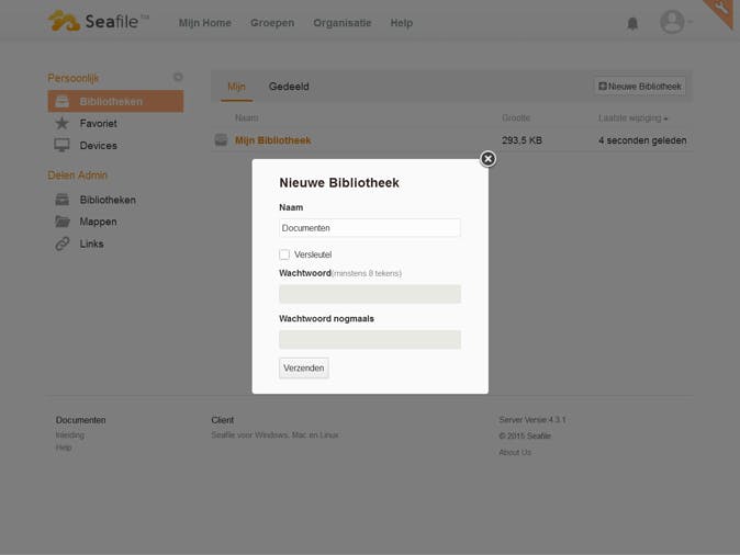Je kunt ervoor kiezen Versleutel aan te vinken, maar wij doen dat nu even niet. Mocht je dat wel doen, weet dan dat het wachtwoord niet op de server wordt opgeslagen en de server-admin de bestanden niet kan inzien. Deze worden voorafgaand aan het uploaden namelijk versleuteld met het wachtwoord dat je nu opgeeft. Klik op Verzenden om de nieuwe bibliotheek aan te maken. Het is handig om een aantal bibliotheken aan te maken, bijvoorbeeld een voor elk bestandstype, maar je kunt natuurlijk zelf bepalen hoe jij je bibliotheken wilt indelen.
