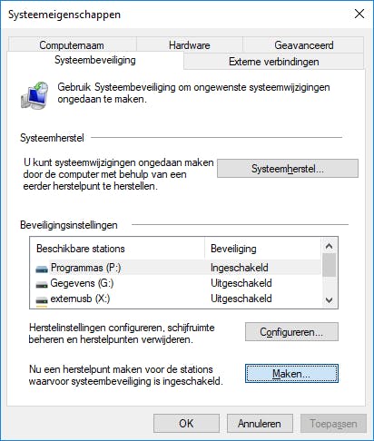 Een update uitvoeren kan ingrijpend zijn en dus neem je je voorzorgsmaatregelen. Dat kan in de vorm van een systeemherstelpunt. Loopt er iets fout, dan kun je je systeem in principe terugzetten. Druk op de Windows-toets en tik herstel in. Kies Een herstelpunt maken en controleer of Systeemherstel voor je station(s) is ingeschakeld. Zo niet, dan regel je dat via Configureren / Systeembeveiliging inschakelen. Vervolgens druk je op Maken om een herstelpunt te creëren. Terugkeren naar een eerder herstelpunt kan door Windows-toets+R in te drukken en rstrui.exe uit te voeren, waarna je via Een ander herstelpunt selecteren het gewenste herstelpunt aanduidt.
