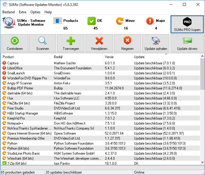 Veel programma’s houden zichzelf up-to-date. Er zijn er echter ook die dat niet doen, zodat je zelf moet nagaan welke aan een update toe zijn. Tijdrovend, behalve als je de gratis tool SUMo Lite inzet (ook beschikbaar in een portable versie). De eerste keer kies je Geïnstalleerde software automatisch detecteren. Even later krijg je een lijst met alle geïnstalleerde software die SUMO herkent (en SUMo kent er erg veel). Je verneemt van elke applicatie meteen welke aan een (Minor of Major) update toe zijn. Het automatisch downloaden en installeren van de updates is voorbehouden aan de betaalde Pro-versie (14,99 euro).
