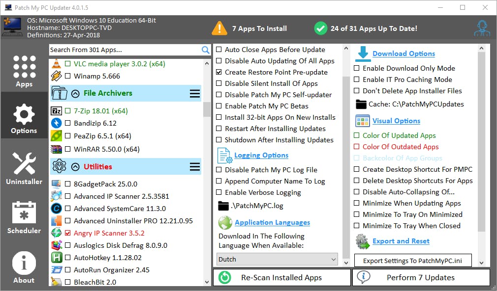 Patch My PC Updater mag dan niet zoveel applicaties detecteren als SUMo, dit portable programma kan eventuele updates wel volautomatisch downloaden en installeren. Een ingebouwde scheduler laat je tevens toe de controle en de updates op gezette tijden uit te laten voeren. Alle gedetecteerde toepassingen worden in een lijstje getoond en verouderde items worden desgewenst automatisch geïnstalleerd, gewoon netjes op de achtergrond als je dat wenst. De voorkeurstaal van de applicaties is in te stellen en je kunt voor de updates ook een systeemherstelpunt laten maken.