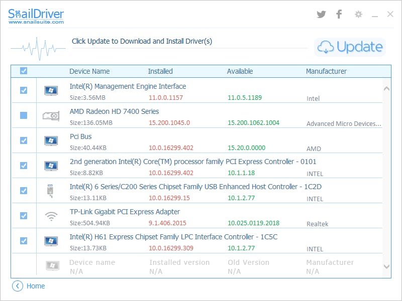 Alle drivers zelf controleren op updates is behoorlijk tijdrovend. Met het gratis SnailDriver gaat dat veel sneller. Wij verkiezen de iets oudere versie (1.0.0.3) omdat die minder opdringerig is dan de nieuwste editie. De werking is eenvoudig: start de tool, druk op Scan en even later toont SnailDriver de apparaten waarvoor een verouderd stuurprogramma werd gedetecteerd. Laat de vinkjes staan naast de drivers die je wilt updaten en klik op Update. Via het tandwielpictogram bepaal je onder meer of SnailDriver met Windows mag opstarten, wat de downloadmap is en of je vooraf een herstelpunt wilt maken.
