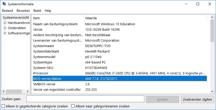 Het kan gebeuren dat ook je systeembios aan een update toe is en dat de update je wel de moeite lijkt. Zo’n update vergt enige voorbereiding. Allereerst moet je er zeker van zijn dat het om de juiste biosversie gaat. De systeemhandleiding kan je dat vertellen maar het kan ook softwarematig: druk op Windows-toets+R en voer msinfo32 uit: je leest het af bij BIOS-versie/datum. Of je gaat naar de opdrachtprompt en je voert het commando systeminfo uit, waar je de nodige info vindt bij BIOS Version.