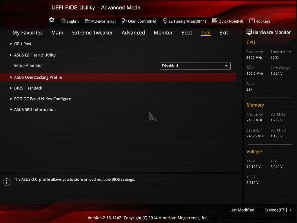 Zorg dat je eerst een veiligheidskopie van je bios-instellingen maakt. Open hiervoor eerst het bios-setupvenster. Hoe je dat doet vindt je in de handleiding, gewoonlijk kan dat door bij het opstarten van je pc op een speciale toets als F12, Del of Esc te drukken. Wellicht vind je zo’n back-upoptie al in de bios-setup zelf (zoals de O.C. Profiles van ASUS). Zo niet, maak dan (met je smartphone) foto’s van alle bios-instellingenvensters. Ben je klaar, stel de biosinstellingen dan bij voorkeur in op de standaardwaarden via een optie als Load (bios) default values / settings. Zo nodig schakel je de optie Bios write protection uit.