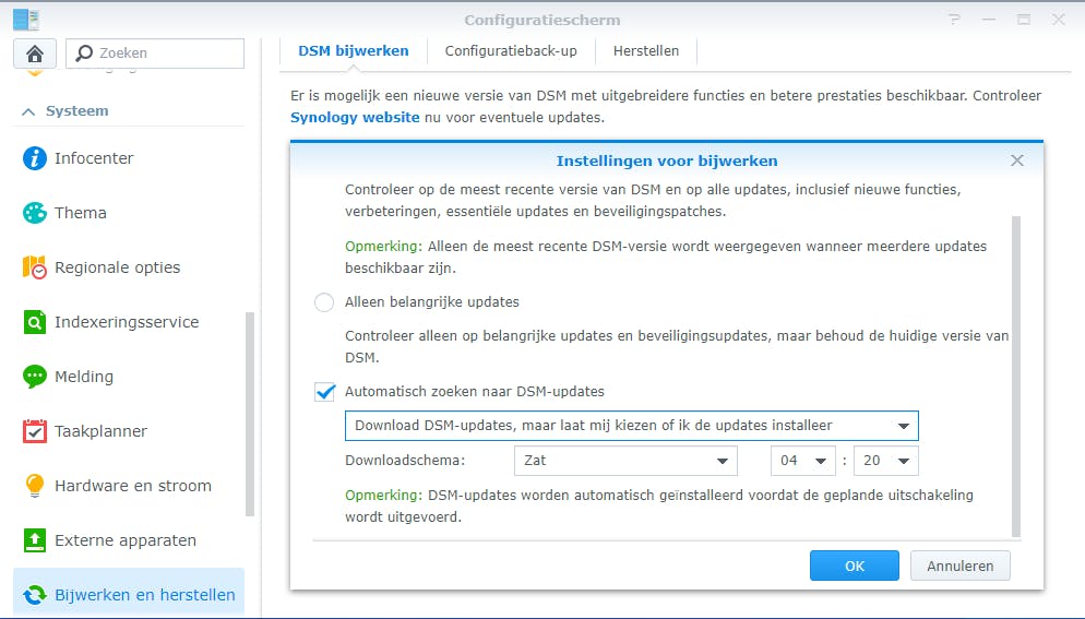 Beginnen we met een populair nas-model, een Synology DS214 (de procedure is voor veel andere modellen hetzelfde). Meld je via de webinterface aan bij je nas en open het Configuratiescherm. Bij Systeem vind je Bijwerken en herstellen. Het DSM-systeem controleert of het up-to-date is. Is het systeem aan een update toe dan regel je dat met een paar muisklikken. Onderbreek het proces onder geen beding! Je nas zal automatisch herstarten. Overigens controleer je het best ook regelmatig of de geïnstalleerde apps op je nas wel bijgewerkt zijn: open het Package Center en kies (Alles) bijwerken.