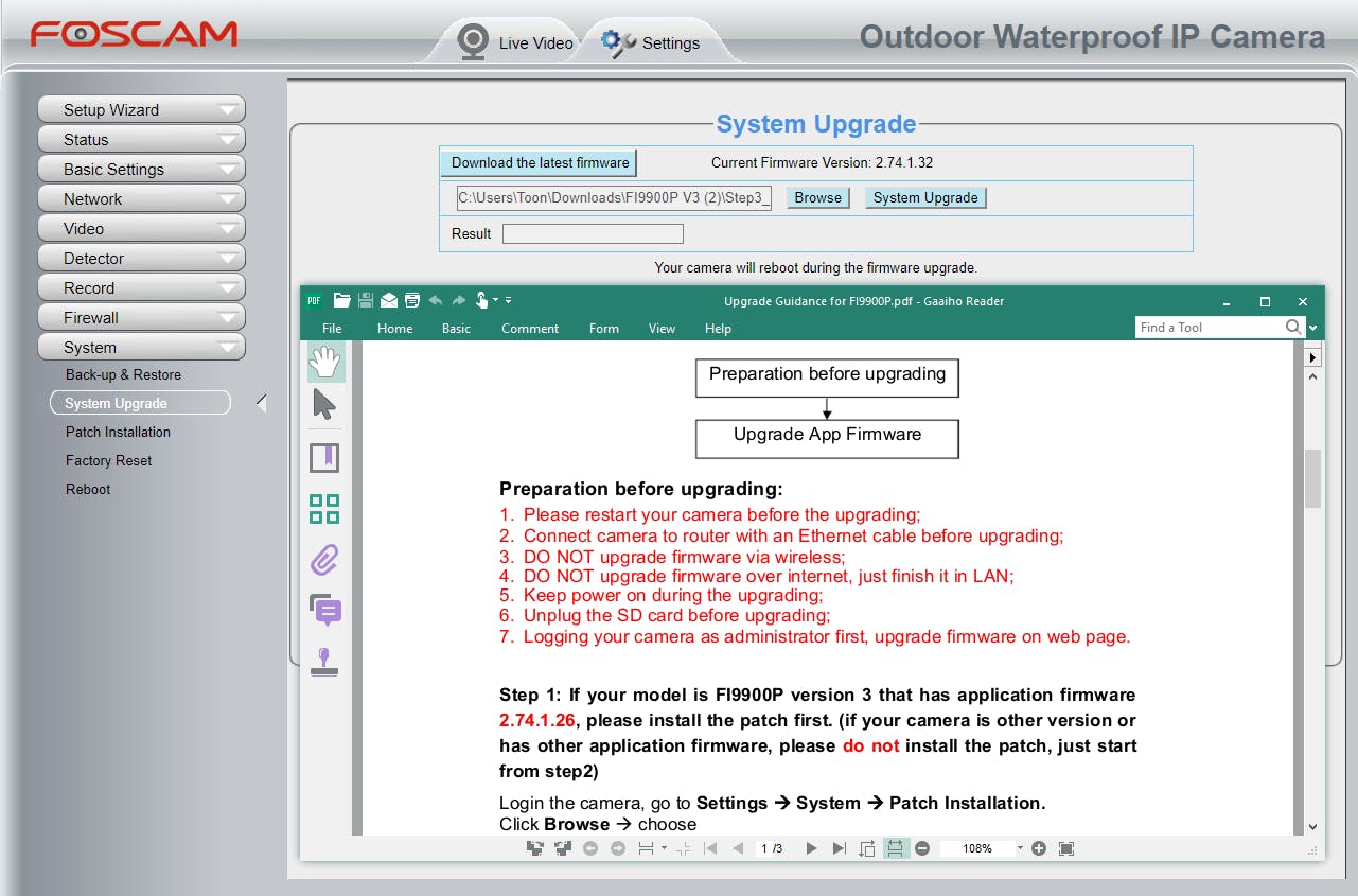Heb je een netwerkcamera, dan kan het van groot belang zijn die van updates te voorzien. Niet alleen omwille voor de stabiliteit en functionaliteit maar ook voor de veiligheid: updates dichten immers vaak veiligheidslekken. De update-mogelijkheid voor onze ip-cam, een Foscam FI9900P, vinden we bij Settings / System / System Upgrade. Klik hier op Download the latest firmware, neem grondig de bijhorende instructies door en kies via Browse het gedownloade (en uitgepakte) upgrade-bestand. Installeer het via System Upgrade. Kijk ook even of je de huidige camera-instellingen eerst kunt veiligstellen. Op genoemde ip-cam kan dat via Settings / System / Back-up & Restore.