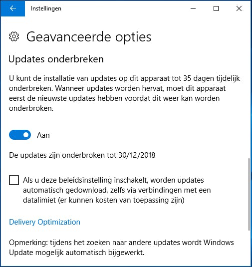Microsoft maakt het gebruikers van Windows 10 lastig om het automatische updateproces van Windows tegen te gaan en daar valt veel voor te zeggen. Wel kun je op elk moment zelf nieuwe updates laten installeren. Ga naar de Instellingen van Windows en kies Bijwerken en beveiliging / Windows Update / Naar updates zoeken of desgewenst Nu installeren. Gebruikers van Windows 10 Professional, Education of Enterprise kunnen updates tot 35 dagen pauzeren. Open hiervoor opnieuw Windows Update, kies Geavanceerde opties en zet de schakelaar bij Updates onderbreken op Aan.