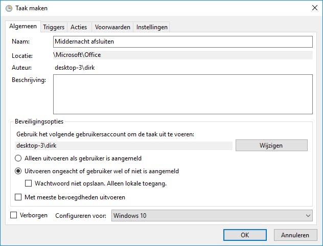 In principe kun je via Energiebeheer de computer ook automatisch laten afsluiten na een bepaalde periode van inactiviteit. De methode via een Taakplanner-script die we hier uitleggen, heeft echter het voordeel dat je een bepaald tijdstip kunt instellen. Open deze tool door ‘taakplanner’ te typen in het zoekvak van het startmenu. Je zult merken dat er al taken in deze tool zitten. Andere applicaties volgen immers dezelfde weg om op gezette tijdstippen automatisch naar updates te zoeken. In de rechterkolom staan de Acties. Klik op de actie Taak maken. Geef de nieuwe taak een naam, bijvoorbeeld ‘Middernacht afsluiten’ en vink de optie Uitvoeren ongeacht de gebruiker wel of niet is aangemeld aan. Helemaal onderaan bij Configureren voor selecteer je Windows 10.