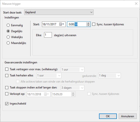 Daarna klik je op het tabblad Triggers en gebruik je de knop Nieuw. In dit venster zorg je dat bij Start deze taak in de optie Gepland staat. Vervolgens moet je aangeven op welke dagen de pc deze taak moet uitvoeren: Eenmalig, Dagelijks, Wekelijks of Maandelijks. Vink Dagelijks aan. Door deze optie opent zich een keuzevenster waar je moet aanduiden op welke tijd deze actie moet plaatsvinden. In ons voorbeeld is dat middernacht. Klik op OK om deze instellingen te bewaren.