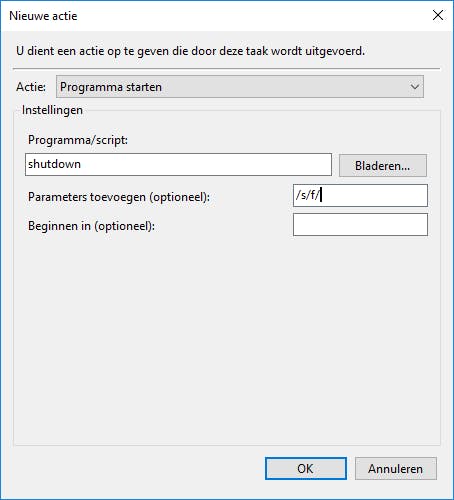 Deze nieuwe trigger verschijnt bij de taken. Selecteer deze taak en open het tabblad Acties. Klik op Nieuw. In het vak Actie moet je de optie Programma starten selecteren. Vul in het vak Programma/script de opdracht shutdown in. In het vak Parameters toevoegen noteer je /s/f. Klik op OK om dit venster te sluiten. Om te zorgen dat het script de computer niet uitzet wanneer je om middernacht nog aan werk bent, selecteer je de taak en open je het tabblad Voorwaarden. Hier geef je als voorwaarde op dat het toestel een halfuur inactief moet zijn, en dat hij een uur moet wachten alvorens de activiteit van de computer opnieuw te controleren. Ten slotte is er het tabblad Instellingen. Hier bepaal je wat er moet gebeuren als de taak mislukt. Vink de optie Als de taak mislukt, opnieuw opstarten elke en vul het aantal minuten in waarna deze actie opnieuw een poging mag ondernemen.