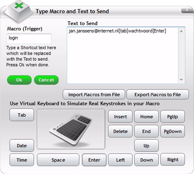 In het vak Text to Send typ je de tekst die automatisch verschijnt wanneer je de trigger typt. Onderaan in dit venster staat een virtueel toetsenbord om bijzondere toetsen in het Text to Send-vak in te voeren. Op die manier is het mogelijk een macro te schrijven waarmee je formulieren kunt invullen, waarbij je de tekst laat verspringen via de Tab-toets en waar je ook de toetsen Up, Down, Left, Right en Enter gebruikt. Ben je klaar, dan klik je op OK.