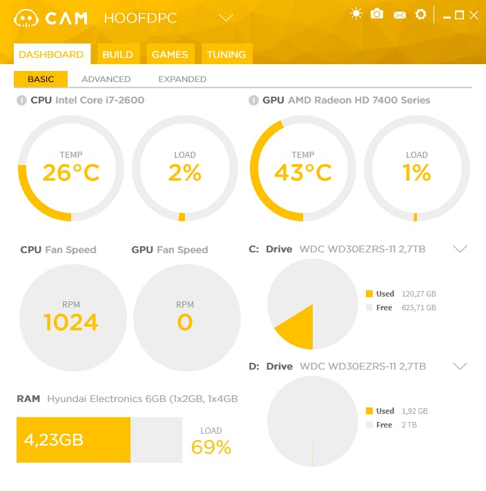 Zodra de app is opgestart, kom je bij je dashboard, waar je direct al informatie over je computer ziet. Je leest de actuele temperatuur en belasting af van de cpu en gpu, evenals de snelheid van de ventilatoren. Je ziet ook hoeveel ram en schijfruimte er nog vrij is. Nog meer informatie krijg je op de tabbladen Advanced (voor cpu, gpu, moederbord, ram, hdd en netwerkadapter) en op het tabblad Expanded (onder meer met de temperatuur van de cpu-kernen en diverse systeemspecificaties). Gevorderde gebruikers die het onderste uit hun grafische processor willen halen kunnen terecht op het tabblad Tuning. Nadat je hier de schakelaar op ON hebt ingesteld, kun je de gpu overklokken. De voltages kun je echter niet aanpassen en het aantal MHz waarmee je de core-clock en het geheugen kunt verhogen, is gelimiteerd. Om echt het uiterste van je processor te vragen kun je dus beter een ander programma gebruiken.