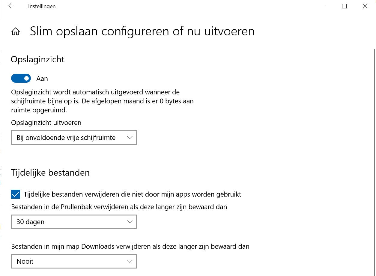 Een beetje hulp bij het opgeruimd houden van je computer kan geen kwaad. Windows heeft Slim opslaan in huis: met dit onderdeel maak je automatisch ruimte vrij door ongebruikte bestanden (zoals tijdelijke bestanden en de inhoud van de Prullenbak) op te schonen. De optie is standaard uitgeschakeld: zet ‘m aan. Open het instellingenvenster (Windows-toets+I) en kies Systeem, Opslag. Zet de schuif op Aan bij de optie Slim opslaan. Klik meteen op Slim opslaan configureren of nu uitvoeren. We zetten Opslaginzicht ook meteen aan: hiermee denkt Windows met je mee als de schijfruimte flink afneemt. Je bepaalt zelf wanneer dit moet worden uitgevoerd, bijvoorbeeld Bij onvoldoende schijfruimte. In de sectie Tijdelijke bestanden geef je aan wat er moet gebeuren met de tijdelijke bestanden.