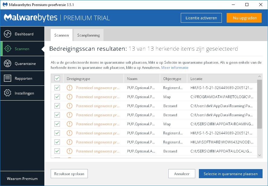Uiteraard is het Windows 10-systeem beveiligd tegen malware via de ingebouwde Windows Defender. Je opent deze toepassing door de naam te typen in de zoekbalk. In het hoofdvenster klik je op Nu scannen. Het is een goed idee om af en toe een second opinion te vragen aan een andere tool zoals Malwarebytes Anti-Malware. De gratis versie zoekt en verwijdert malware, de betaalde premiumversie voorkomt infecties. Die premiumversie mag je veertien dagen gratis proberen. Bij ons vond Malwarebytes toch nog potentiële bedreigingen terwijl Windows Defender ‘alles veilig’ meldde.