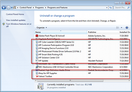 Hardwareleveranciers schrikken er niet voor terug om talloze extra's bij hun software mee te leveren. Denk bijvoorbeeld aan software voor een 'customer participation program', aan een programma waarmee u tonercartridges online aan kunt schaffen of aan de eerder genoemde Yahoo-toolbar, die na een onbewuste installatie ineens in ieder browservenster opduikt. Om uw computer schoon te houden, is het belangrijk om goed na te kijken wat er allemaal daadwerkelijk is geïnstalleerd. Open via Start het Configuratiescherm, klik op Programma's, Een Programma verwijderen en kijk in de lijst na welke software er tijdens de installatie bij is gekomen. Klik op Geïnstalleerd op om de programma's in volgorde van installatiedatum te sorteren, zodat het zoeken wat gemakkelijker wordt. U kunt ook uw muis boven Geïnstalleerd op zetten en vervolgens even wachten tot rechts een pijl omlaag verschijnt. Klik op deze pijl en selecteer de datum of de periode waarin de software op de pc is gezet.