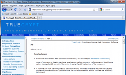 Genoeg over de gevaren van nieuwe downloads en drivers. Er is namelijk ook mooie nieuwe software die u helpt om uw beveiliging te verbeteren. Zo is er enige tijd geleden een nieuwe versie van TrueCrypt verschenen. TrueCrypt 7.0 is de eerste versie van het versleutelingspakket die hardwarematige AES-versleuteling ondersteunt. Dat wil zeggen dat het versleutelen en ontsleutelen van de gegevens veel sneller gaat, mits u over een moderne computer beschikt. Met dat laatste bedoelen we een pc met een Intel i5- of i7-processor, want deze ondersteunen de hardwarematige acceleratie van AES. We hebben al vaker aandacht besteed aan TrueCrypt, dat kan worden gebruikt om beveiligde containerbestanden te maken. Dergelijke bestanden kunnen worden gebruikt als een harde schijf waar bestanden in worden geplaatst die vervolgens alleen met een wachtwoord kunnen worden bekeken en geopend. U kunt met TrueCrypt echter ook de hele harde schijf van een computer versleutelen. Daarmee ontneemt u dieven iedere mogelijkheid om toegang tot de gegevens op uw schijf te krijgen. Deze beveiligingsmethode is vooral aanbevelenswaardig bij computers die u meeneemt op reis, zoals notebooks en netbooks. Het programma ondersteunt Windows, Mac OS X en Linux.