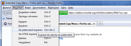 Internet is een enorme bron van informatie. Alles is er te vinden, is het niet via een min of meer betrouwbare bron als Wikipedia, dan wel op een obscure Russische website. Vaak wordt informatie die afkomstig is van internet hergebruikt, bijvoorbeeld in een document. Selecteren, kopiëren en plakken, het is allemaal heel eenvoudig. Maar met de eenvoud komt ook het risico. Als u bijvoorbeeld een tekst op een webpagina selecteert en hem vervolgens in een Word-document plakt, ziet u al snel dat u niet alleen tekst hebt overgenomen, maar ook opmaak, plaatjes en koppelingen naar andere pagina's. Dat is niet alleen onhandig, het kan ook gevaarlijk zijn, omdat er zaken meekomen die u helemaal niet wilt hebben. Een handige plug-in die dit voorkomt als u met Firefox surft, is Copy Plain Text. Start Firefox en kies Extra, Add-ons. Gebruik de zoekfunctie en zoek op Extended Copy Menu. Klik daarna op Toevoegen aan Firefox, Nu installeren. Als u Firefox opnieuw start en een deel van een pagina of zelfs een hele pagina selecteert, vindt u in het menu Bewerken twee nieuwe opties. Een daarvan is Als platte tekst kopiëren. Maak hier voortaan gebruik van om teksten die op internetpagina's staan 'puur' te kopiëren, dus zonder allerlei ongewenste bijzaken. De optie kan ook via een sneltoets worden geactiveerd, door met de rechtermuisknop op een selectie te klikken en vervolgens op Ctrl+Alt+C te drukken.