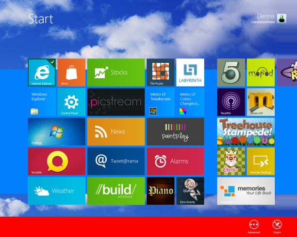 De opbouw van de tegels in het startscherm lijkt willekeurig. Zo heeft de wekkerapplicatie een dubbele tegel, terwijl Internet Explorer het met een enkele tegel moet doen. Met een eenvoudige handeling kunt u een tegel kleiner of juist groter maken. Klik met de rechtermuisknop op de tegel waarvan u de grootte wilt veranderen. In de balk eronder vindt u het pictogram Larger (indien de tegel groter kan worden gemaakt) of Smaller (als de tegel kleiner kan). Verder vindt u in deze balk de mogelijkheid om een applicatie vast te pinnen aan of juist los te maken van het startscherm (respectievelijk Pin en Unpin). Daarnaast is de optie Advanced interessant, als deze voor de geselecteerde applicatie beschikbaar is. Klikt u met rechts bijvoorbeeld op de tegel van Windows Explorer, dan hebt u via de optie Advanced toegang tot extra opties, bijvoorbeeld om de bestandslocatie van Verkenner te openen.
