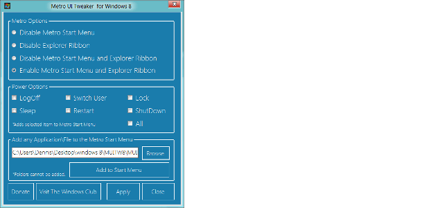 Wilt u toch graag via het startscherm een applicatie openen, maar staat hij er niet standaard in, dan is het ook mogelijk om hem zelf toe te voegen. Met het gratis programma Metro UI Tweaker for Windows 8 voegt u apps toe aan het startscherm. Ga naar The Windows Club en download de nieuwste versie. Open het programma en klik op de knop Browse (in de onderste sectie Add any Application\File to the Metro Start Menu). Navigeer naar het programma dat u wilt toevoegen en selecteer het. Klik tot slot op de knop Add to Start Menu. Het onderdeel is voortaan beschikbaar via het algemene startscherm.