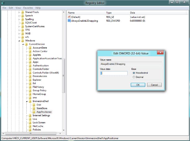 Met de nieuwe functie Snap in Windows 8 kunt u schakelen tussen het traditionele bureaublad en het nieuwe startscherm. Hebt u bijvoorbeeld het bureaublad geopend, dan kunt u via een smalle balk aan de zijkant van het scherm het nieuwe startscherm openen. Of u met Windows 8 kunt 'snappen', hangt af van de schermresolutie. De functie is dus niet altijd beschikbaar. Bij een te lage schermresolutie lijkt Snap niet te werken. Gelukkig kunt u via het Windows-register afdwingen dat Snap alsnog wordt geactiveerd. Druk op Windows-toets+R. In het venster Run typt u Regedit.exe. Klik op OK en navigeer naar de sleutel HKEY_CURRENT_USER\Software\Microsoft\Windows\CurrentVersion\ImmersiveShell\. Kies New / Key. Noem deze AppPositioner. Kies hierna New / DWORD-waarde. Noem deze AlwaysEnableLSSnapping. Dubbelklik op AlwaysEnableLSSnapping en typ een 1 in het vak Value Data. Klik op OK en verlaat het register. Nadat u Windows opnieuw hebt gestart, is de Snap-functie beschikbaar en schakelt u eenvoudig tussen het startscherm en het bureaublad. Werkt u liever niet zelf in het register, dan kunt u een programma gebruiken dat deze handmatige aanpassing uit handen neemt. Download Snap Enabler. Klik op Enable Windows 8 Snap Feature.