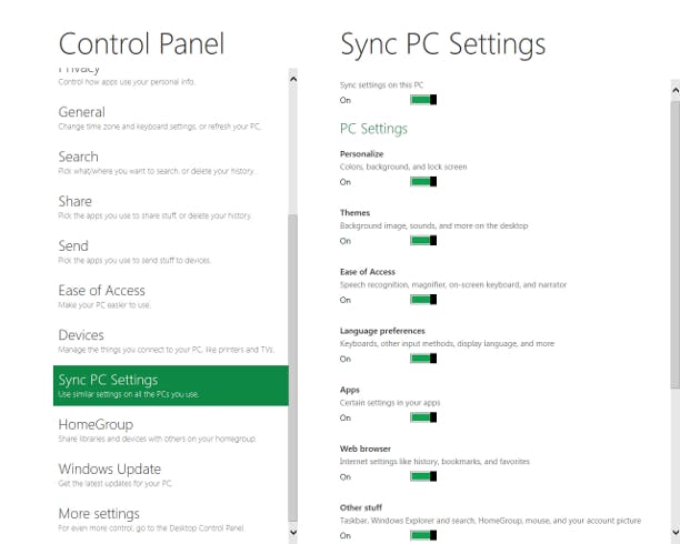 Windows 8 kent een nauwe integratie met Windows Live. Zodra u zich aanmeldt met uw Windows Live ID (dat onder meer wordt gebruikt door Hotmail en Messenger), kunt u de instellingen van de computer synchroniseren met andere computers. In het Control Panel kiest u voor Users. Klik op Switch to a Windows Live ID. Geef de juiste informatie op. De eerstvolgende keer meldt u zich aan met uw Windows Live ID. Open hierna het Control Panel en kies de nieuwe optie Sync PC Settings. Bij de optie Sync settings on this PC kiest u On. Vervolgens geeft u in de sectie PC Settings aan welke onderdelen moeten worden gesynchroniseerd. Denk hierbij aan de bureaubladachtergrond, thema's, instellingen van applicaties en favoriete websites. Als u zich op een andere Windows 8-computer met uw Windows Live ID aanmeldt, zijn deze onderdelen ook beschikbaar.