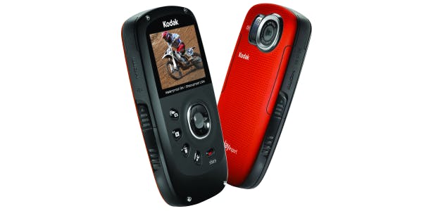 De KODAK PLAYSPORT Zx5 lijkt op zijn voorganger PLAYSPORT Zx3. Ook dit is een stevige waterbestendige camcorder die tegen een stootje kan. Een verschil met de PLAYSPORT Zx3 is dat KODAK de knoppen net want handiger op het apparaat geplaatst heeft, en een knop heeft toegevoegd om media direct te uploaden naar bijvoorbeeld Facebook, Twitter, Flickr of YouTube. Net als bij het vorige model is de bouwkwaliteit erg goed. Het apparaat weegt 125 gram en is daarmee niet te zwaar of te licht. Hij past comfortabel in de hand, waarbij de knoppen handig met de duim te bereiken zijn. Een licht reliëfpatroontje voorkomt dat de camera snel uit uw handen zal glijden. De lens en microfoon zitten bovenaan zodat uw vinger niet snel het beeld of geluid zal storen. De camera heeft 4 x digitale zoom, maar dat is geen vervanger van een echte optische zoom en dus niet bijzonder nuttig. Een verschil ten opzichte van de Zx3 is dat de accu nu vast is ingebouwd en dus niet verwisselbaar is. De Zx5 heeft vrijwel geen eigen geheugen, u hebt een geheugenkaartje nodig om hem te gebruiken. Door de waterbestendigheid heeft deze camera geen uitklapbare usb-connector die we wel terugvinden op andere camcorders.