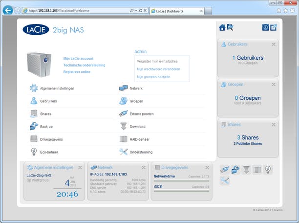Het aantal poorten op de NAS is bij LaCie eveneens beperkt met maar één usb2.0-poort, één eSATA-poort en één gigabit netwerkpoort. Niet alleen ontbreekt dus een usb-poort op de voorkant om snel bestanden van een geheugenstick naar de NAS te kopiëren, ook is er geen usb 3.0 en geen tweede netwerkaansluiting. Allemaal zaken die bij andere NAS-apparaten in de prijsklasse van deze LaCie inmiddels toch wel standaard zijn.