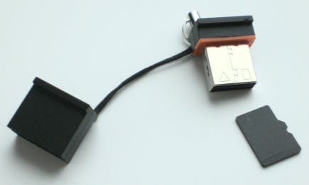 Bij het bestuderen van de MosKeyto viel ons op de usb-connector een piepklein pictogram (van een microSD-kaartje) op. Bij nadere inspectie ontdekten we inderdaad een microSDHC-kaartje in de connector. Normaal gesproken kunt u die niet verwijderen, maar een hobbymesje lost dat simpel op. Het blijkt om een microSDHC-kaartje met 4 GB te gaan dat gemaakt is door Samsung. Een slimme constructie van LaCie, want zo kunnen ze de mosKeyto eenvoudig met verschillende geheugencapaciteiten uitbrengen. Aangezien er vergelijkbare SDHC-kaartlezertjes zijn die op de mosKeyto lijken, hadden we het leuk gevonden als LaCie het kaartje eenvoudig verwijderbaar had gemaakt.