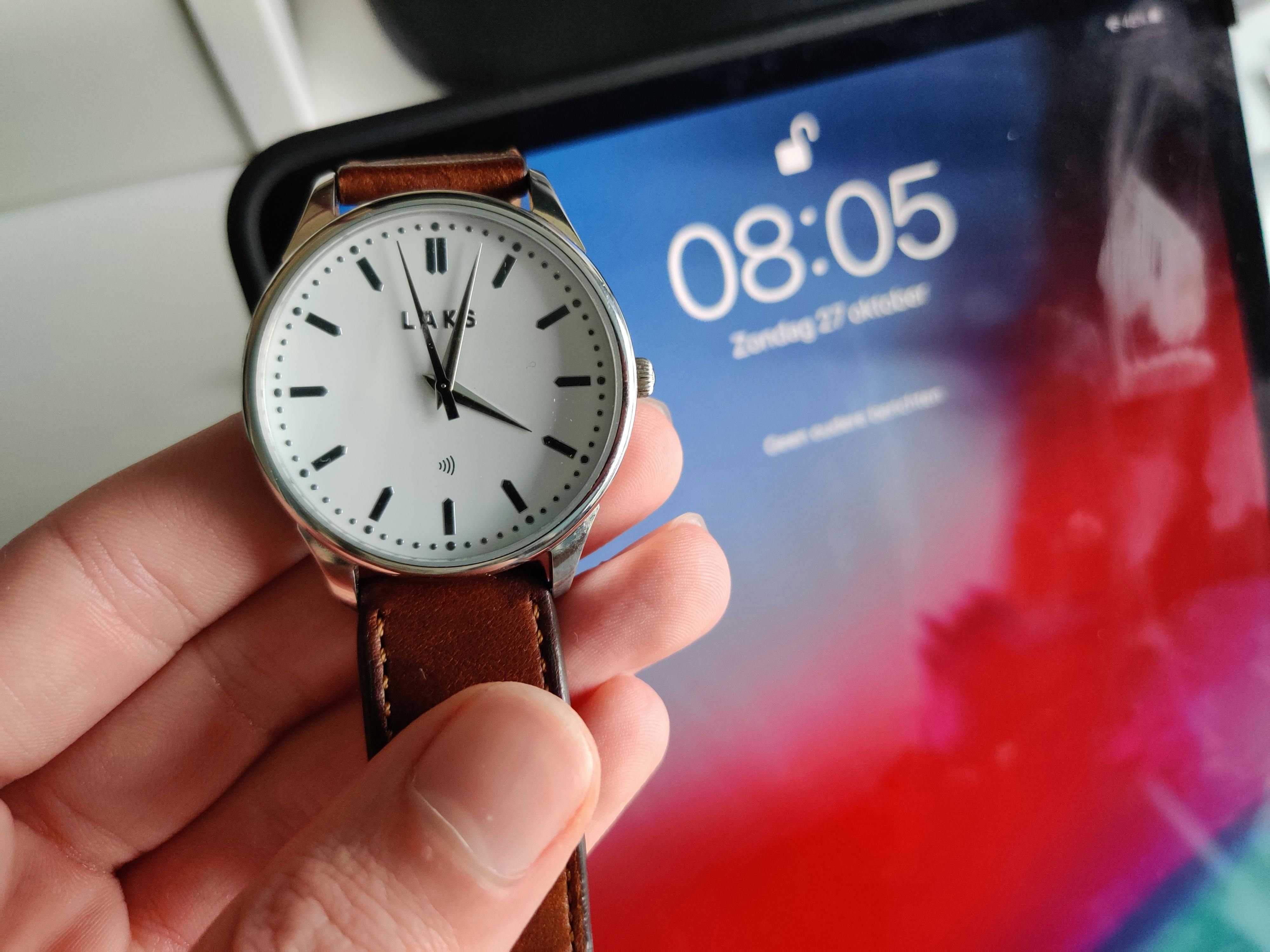 Wie bij ABN Amro zit of gaat overstappen, kan een geschikte wearable van Laks of één van de andere partnermerken kopen. Het spatwaterdichte Laks-horloge dat ik testte, viel me tegen. Niet omdat je de losse betaalchip in de horlogeband moet stoppen – dat is juist een voordeel. Het is deels de leren band die me niet kan bekoren. Hij heeft weinig gaatjes (ik heb er een paar laten bijprikken) en ook na maanden dragen is hij nog stroef, en daarom zit hij nog steeds niet zo lekker.