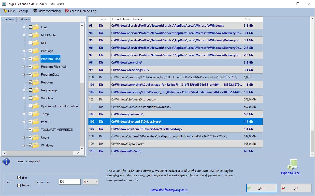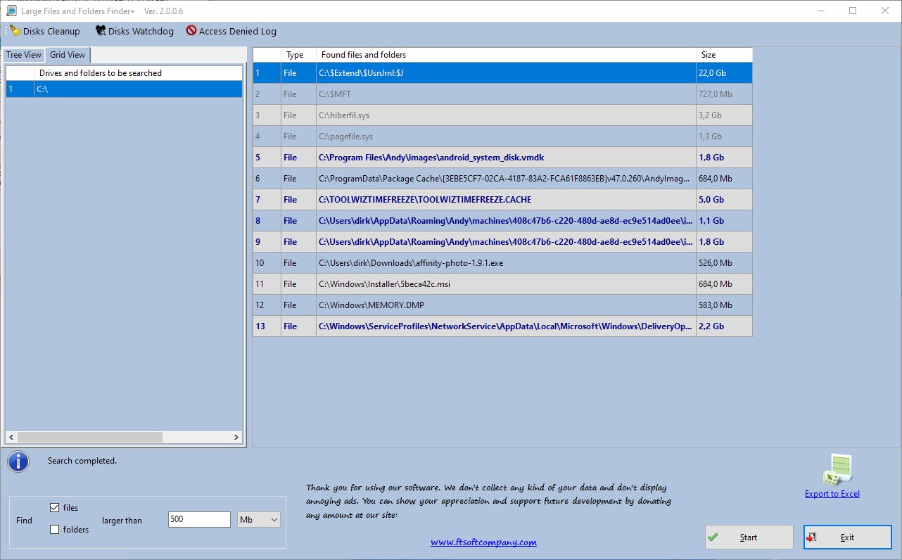 Standaard staat de scanner ingesteld op 500 Mb, maar je kunt onderaan bij de zoekopties de minimale grootte aanpassen die deze tool moet hanteren. Wil je niet dat mappen in de resultaten worden opgenomen, dan gebruik je alleen de optie Files en haal je het vinkje bij Folders weg. Hoewel de meeste van de gevonden items grote systeembestanden zijn die je niet zomaar kunt verwijderen, kom je meestal toch uit bij een aantal slokkoppen.