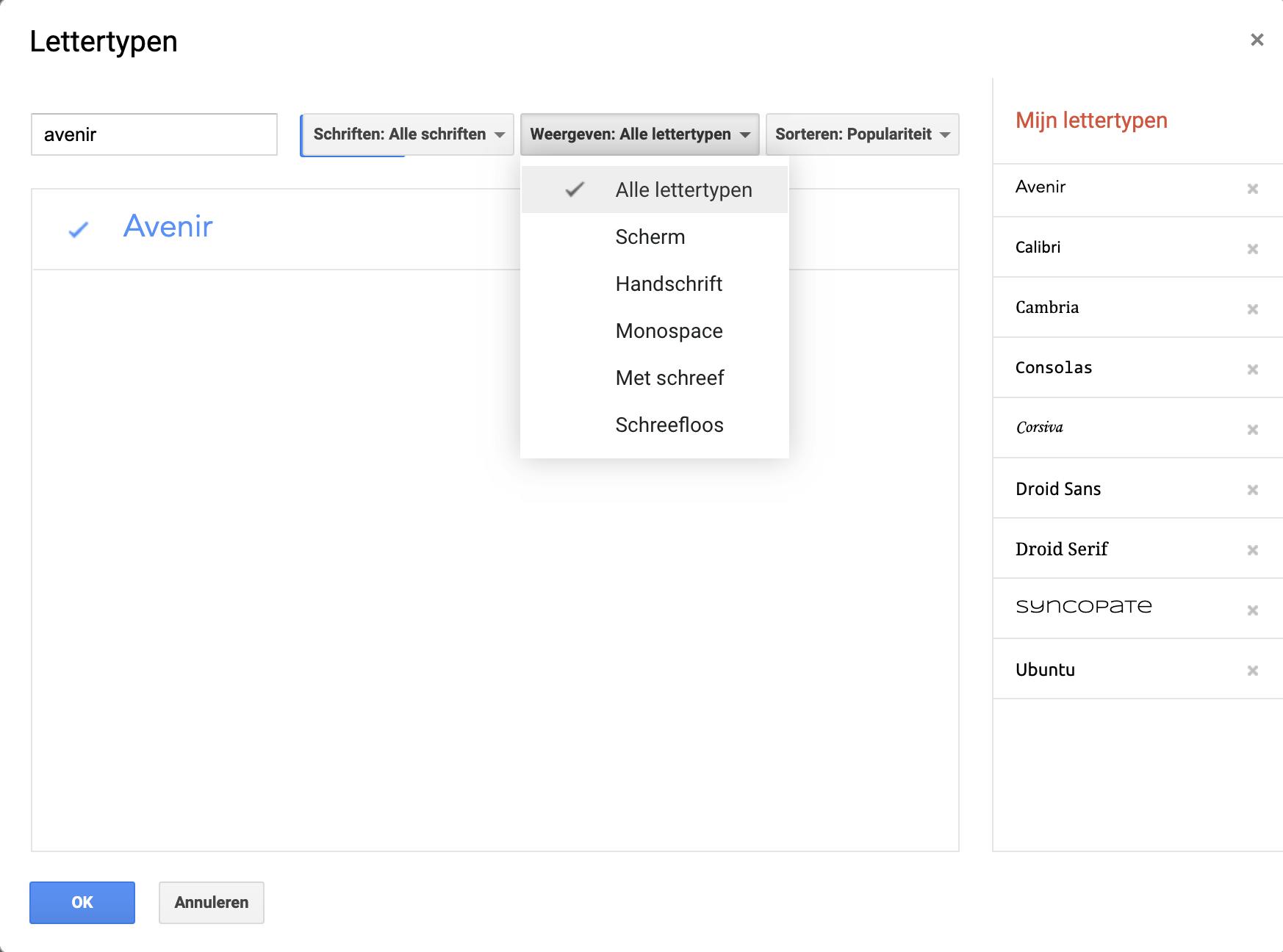 In een pop-upvenster krijg je een vervolgkeuzelijst waar je lettertypen aan je gebruikslijst kunt toevoegen en weghalen. Weet je al in welk lettertype je tekst moet komen te staan, dan kun je in het zoekvak naar die naam zoeken. Op die manier vind je bijvoorbeeld het lettertype Avenir, dat niet in de basislijst staat. Klik eerst op de naam, zodat er een vinkje naast verschijnt en daarna op OK om dit lettertype toe te voegen. De wijzigingen die je aanbrengt in Mijn lettertype zul je terugvinden in de vervolgkeuzelijst van de werkbalk. Om een item uit jouw persoonlijke lijst lettertypen te verwijderen, klik je op de X ernaast. Sommige lettertypen, zoals Arial en Times New Roman, kun je niet verwijderen. Je kunt ook zoeken naar een bepaalde stijl, zoals Monospace voor lettertypen die allemaal dezelfde breedte innemen of Handschrift voor letters in een handgeschreven stijl. Daarnaast kun je lettertypes selecteren voor verschillende schrijfsystemen. Als je hier bijvoorbeeld Arabisch selecteert, dan presenteert Google Drive een mooie set lettertypen.