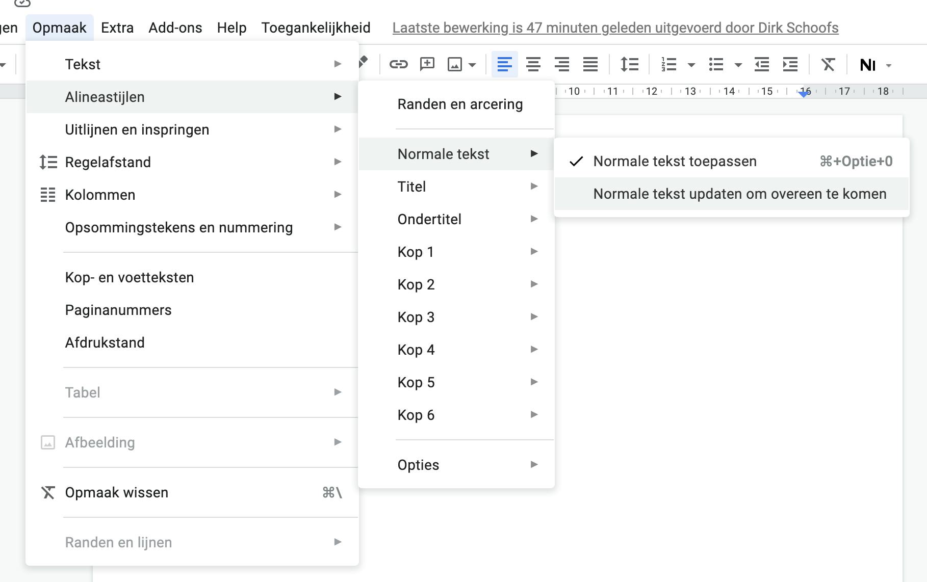 Ieder nieuw lettertype dat je vindt, kun je instellen als jouw persoonlijke standaardlettertype in Google Documenten. Zorg dat de stijl in de optiebalk is ingesteld op Normale tekst. Typ een paar woorden in het gewenste lettertype en markeer deze met de muisaanwijzer. Daarna kies je de opdracht Opmaak / Alineastijlen / Normale tekst en vervolgens gebruik je de opdracht Normale tekst updaten om overeen te komen. Ten slotte kies je Opmaak / Alineastijlen / Opties / Opslaan als mijn standaardstijlen.