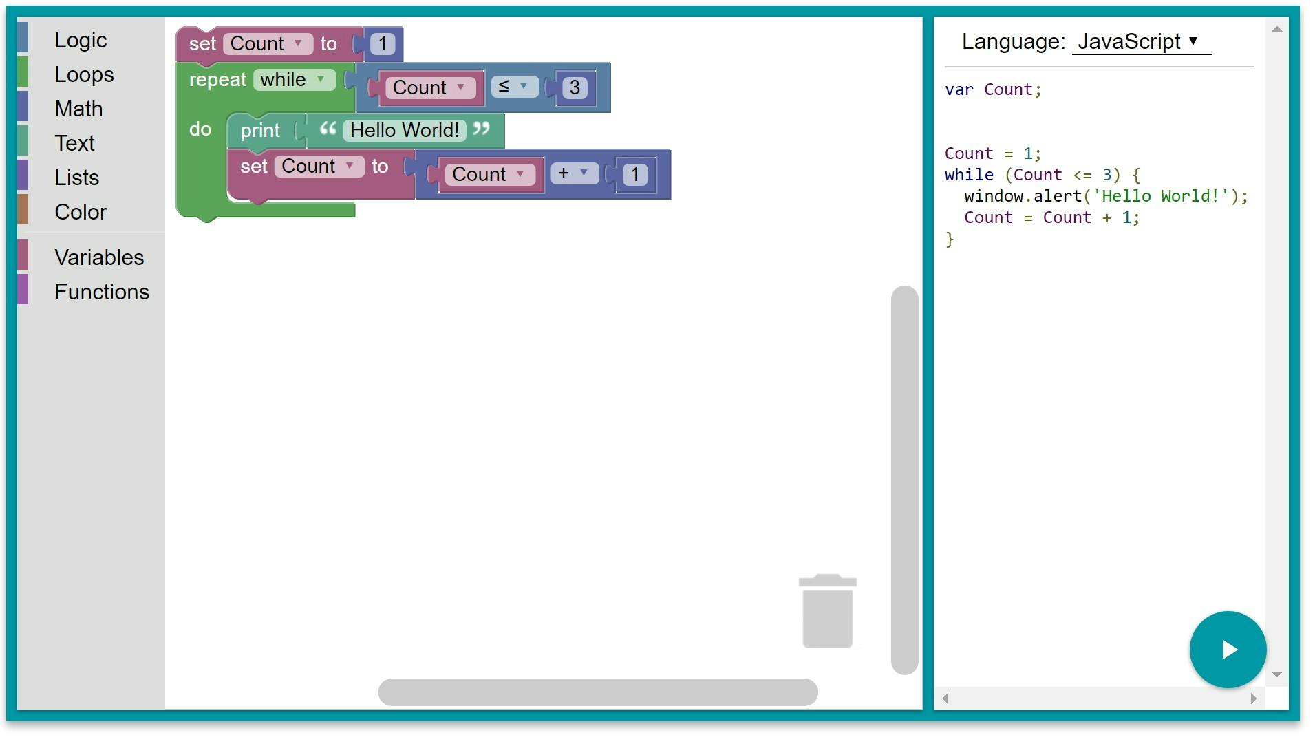 Blockly is een open source project van Google dat gebruikmaakt van het blokkenconcept van Scratch. In de omgeving van Blockly maken de blokken het schrijven van code ook eenvoudiger, maar met Blockly kun je met de blokken JavaScript, Python, PHP, Lua of Dart genereren. Bovendien kan het worden aangepast om code in andere programmeertalen te genereren. Je kunt de taal van Blockly veranderen van het Engels naar het Nederlands.
