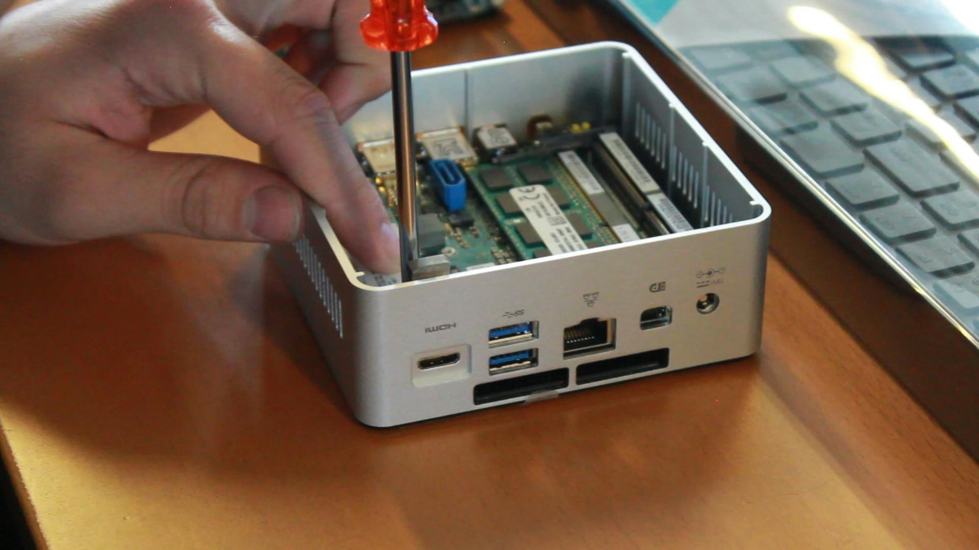 En ook met het plaatsen van de kleine M.2 sata ssd heeft niemand moeite: even schuin insteken en vastschroeven. Daarna kan de behuizing alweer worden gesloten. Nu nog even muis en toetsenbord met behulp van een bluetooth-ontvanger erin prikken, de externe adapter aansluiten en verbinden met de monitor. Klaar.