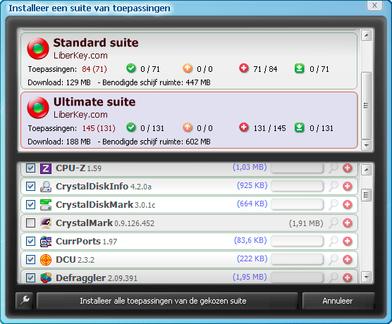 Als u naar de site surft, leest u dat er circa 300 verschillende toepassingen beschikbaar zijn, nog een stuk meer dan de grootste suite. Bijkomende toepassingen laten zich moeiteloos opzoeken en installeren (het LiberKey startmenu heeft hiervoor overigens een zoekfunctie ingebouwd). Vanuit het LiberKey-contextmenu is het verder mogelijk de online catalogus op eventuele updates van geïnstalleerde toepassingen te laten controleren: die haalt u dan met een muisklik binnen.