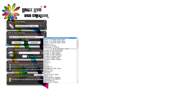 Linux Live USB Creator werkt met vijf stappen. Geef bij Stap 1 de schijfletter op van uw usb-stick. Bij Stap 2 kunt u een iso-bestand aanwijzen of een installatie-cd inlezen vanaf uw cd/dvd-speler. Wij kiezen hier voor Download waarna er een dropdownmenu verschijnt. Zoek hierin de gewenste Linux-distributie, bijvoorbeeld Ubuntu, en bevestig met Automatisch. Linux Live USB Creator zoekt naar de snelste downloadserver en vraagt vervolgens waar u het iso-bestand van Ubuntu wilt bewaren. Kies een eenvoudige locatie, bijvoorbeeld uw bureaublad. Als de stick eenmaal gereed is, kunt u het iso-bestand handmatig verwijderen. Plaats nu bij Stap 4 een vinkje bij verberg de gemaakte bestanden op de usb-key, Formatteer usb met FAT32 Linux Live USB Creator en tenslotte bij Linux in Windows opstarten mogelijk maken.