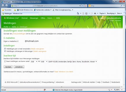 Houd het aantal meldingen onder controle. Dat is soms gemakkelijker gezegd dan gedaan. Hoe meer sociale netwerken u gebruikt, hoe meer meldingen er worden getoond. U kunt echter voorkomen dat u continu wordt gestoord door berichten. Open het venster Opties (klik op uw naam en kies Meer opties) en kies voor de sectie Meldingen. Wilt u niet dat Messenger een melding toont bij een e-mail met updates uit uw sociale netwerken, dan haalt u het vinkje weg bij Ik een e-mail ontvang met updates uit sociale netwerken. Interessanter is echter de optie Meldingen beheren voor updates uit sociale netwerken. U vindt deze onderin het instellingenvenster en als u hem selecteert, wordt er een website geopend waarop u bepaalt of u de meldingen per e-mail wilt ontvangen (kies voor Meldingen per e-mail verzenden) of dat u de meldingen ook in Messenger wilt zien (kies voor Meldingen ontvangen in Messenger). Daarnaast kunt u aangeven tussen welke tijdstippen u geen meldingen van Messenger wilt ontvangen, bijvoorbeeld als u niet wilt worden gestoord tijdens uw werk. Bij de sectie Inactieve tijd plaatst u een vinkje bij Geen meldingen versturen vanaf N tot N, waarbij u voor N de begin- en eindtijd opgeeft. Sluit het venster via de knop op Opslaan.
