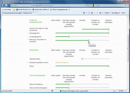 Vergeet niet de privacy-instellingen naar uw hand te zetten, en voorkom dat er teveel persoonlijke informatie wordt gedeeld. In het venster Opties kiest u voor Privacy. Klik op de knop Privacyinstellingen, waarna er een website wordt geopend. U kunt kiezen uit drie opties: Openbaar, Beperkt en Privé. Klik op Huidige instellingen weergeven als u wilt zien wat er voor uw profiel geldt. U kunt de privacyopties instellen door een standaardprofiel te kiezen, maar het is beter om wat tijd vrij te maken en de losse onderdelen afzonderlijk te configureren. Met behulp van de schuifregelaars bepaalt u de rechten per onderdeel. Bij elke activiteit (bijvoorbeeld Nieuwe fotoalbums, Interesses, Favorieten en berichten) geeft u aan welke personen of groepen hiervan op de hoogte mogen worden gebracht. U kiest daarbij tussen Niemand, Sommige vrienden (die met beperkte toegang uitgezonderd), Vrienden, Vrienden en vrienden van vrienden, en Iedereen (Openbaar). Onderaan de pagina kunt u de koppelingen met andere netwerken beheren. Klik op De services die met Windows Live zijn gelinkt weergeven en beheren. U ziet nu een overzicht van de gekoppelde services. Klik op Bewerken om de bestaande instellingen aan te passen.
