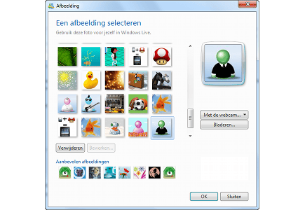 Niet nieuw in Messenger, maar wel belangrijk: uw eigen profielfoto, waaraan anderen u kunnen herkennen. U kunt de foto snel aanpassen. In het hoofdvenster van Messenger klikt u op uw huidige gebruikersafbeelding. Er wordt een nieuw venster geopend, waarin u kunt kiezen uit een set standaardafbeeldingen. Niet tevreden met de standaardafbeeldingen? Klik op de knop Bladeren en wijs een eigen foto aan.