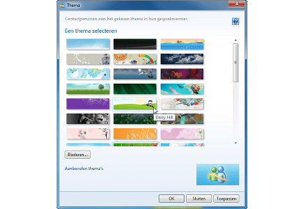 Wilt u Messenger een andere uitstraling geven, dan zijn hier verschillende mogelijkheden voor. Klik met de rechtermuisknop op het bovenste gedeelte van het venster. Kies voor Thema wijzigen. Vervolgens kiest u het gewenste thema uit de lijst. Ook interessant is de mogelijkheid om een eigen thema te maken. U maakt daarvoor gebruik van een eigen afbeelding. Klik op de knop Bladeren en selecteer de afbeelding die u voor het gespreksvenster wilt gebruiken. U kunt de afbeelding zelf kiezen, maar deze moet wel een van de volgende formaten hebben: bmp, gif, jpg of png. Hierna klikt u op Toepassen.