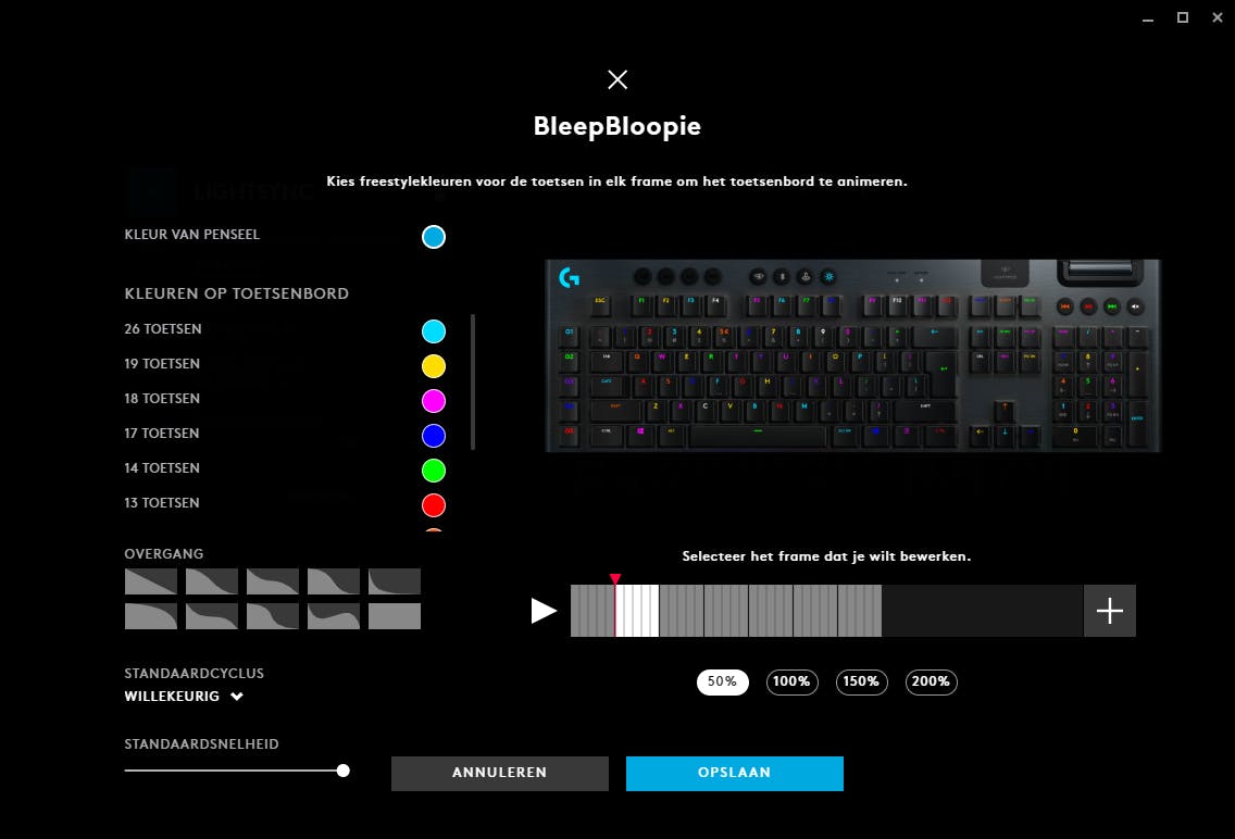 Voor het instellen van de macro’s en de rgb-verlichting is de Logitech G HUB software nodig. Ten opzichte van de Logitech Gaming Software is er veel verbeterd. Gebruikers kunnen gemakkelijk rgb-profielen ontwerpen en delen met andere gebruikers. Per frame kun je een kleur toewijzen, zodat het zelfs mogelijk is om animaties te maken. Ook het maken van macro’s kun je via de software gemakkelijk uitvoeren en eveneens delen met anderen.