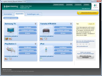 Als uw apparatuur is toegevoegd, dan kunt u Activiteiten aanmaken. Een voorbeeld van een activiteit is Film kijken waarmee u met een druk op de knop de televisie, dvd-speler en versterker aanzet. Wij gebruiken een PlayStation 3 om dvd’s mee te kijken, een apparaat dat zonder extra kastje (Harmony Adapter for PlayStation 3) niet te gebruiken is met de Harmony 600. Toch moesten wij de PlayStation 3 opnemen in Harmony Remote, omdat het niet mogelijk blijkt een activiteit Film kijken te maken zonder dat er bijvoorbeeld een dvd-speler is toegevoegd. Wij zouden voor deze activiteit enkel de televisie en versterker op de juiste ingangen willen aanzetten, maar de software meldt dat er toch echt een dvd-speler aanwezig moet zijn. Wij hebben onze PlayStation 3 dus toch maar toegevoegd. Jammer, want zo verliezen we al één van de vijf apparaten zonder dat we hier iets mee kunnen. Het instellen van de activiteiten kan wat ons betreft dus een stukje flexibeler.