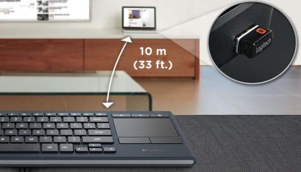 De ontvanger, met een bereik van tien meter, steek je eveneens in een usb-poort. Deze is stijlvol en klein, waardoor de ontvanger nauwelijks uitsteekt. Met name bij tablets met een usb-aansluiting is dit een pluspunt. Nadeel is wel dat je er zorgvuldig mee om moet springen, omdat het gevaar bestaat dat je de ontvanger kwijtraakt als je deze op andere apparaten wil aansluiten. Maar daar heeft Logitech aan gedacht: tot zes apparaten kun je aansluiten op één ontvanger, mits ze dus op tien meter afstand van de ontvanger staan. Voeg de apparaten een voor een toe en je kunt voortaan gemakkelijk de K830 gebruiken op zowel tv, computer of tablet.