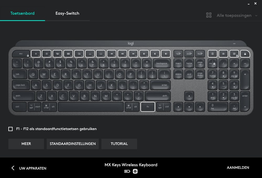 Net als de MX-muizen stel je de MX Keys in met Logitech Options. Met deze software geïnstalleerd kun je het toetsenbord geheel naar wens instellen. Hierbij kun je indien gewenst ook profielen voor verschillende programma’s maken, handig om per programma verschillende functies toe te kennen aan de functietoetsen.