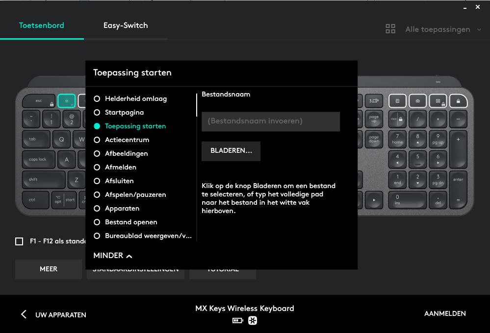 De functietoetsen die standaard werken in de alternatieve modus met de software een andere functie geven waarbij je de keuze hebt uit allerlei functies die het besturingssysteem te beiden heeft. Ook kun je een programma starten, een toetscombinatie toekennen of een bestand openen. Standaard hebben de functietoetsen overigens al handige functionaliteit met fucnties voor vensterbeheer en mediabediening. De knoppen voor helderheid omhoog en omlaag (onder F1 en F2) zullen op veel Windows-systemen echter niets doen en die kun je dus sowieso al op iets anders instellen. Uiteraard kun je ook de klassieke functietoetsen F1 tot en met F12 gebruiken. Dat kan in combinatie met de FN-knop, maar je kunt de klassiek functies via de software ook de standaardfunctionaliteit maken.